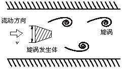在測量管中垂直插入一個柱狀物時,流體通過柱狀物兩側(cè)就交替地產(chǎn)生有規(guī)則的旋渦(如圖所示),這種旋渦列被稱為卡門渦街。卡門渦街的釋放頻率與流體的流動速度及柱狀物的寬度有關(guān),可用下式表示: |