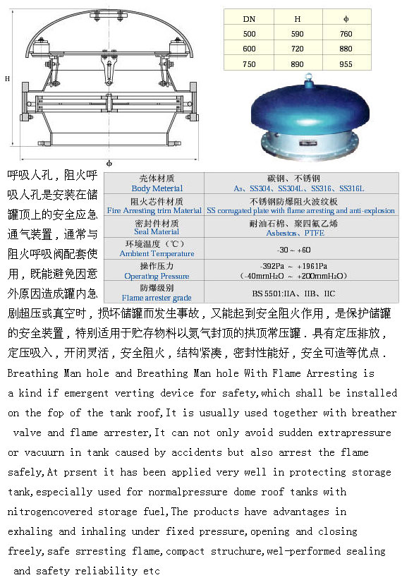 呼吸人孔(KHXF-HR),阻火呼吸人孔是安裝在儲罐頂上的安全應急勇氣裝置,通常與阻火呼吸閥配套使用,既能避免因意外原因造成罐內急劇超壓或真空時,損壞儲罐面發(fā)生事故,又能起到安全阻火作用,是保護儲罐的安全裝置,特別適用于貯存物料以氮氣封頂?shù)墓绊敵汗蕖>哂卸▔号欧牛▔何耄_閉靈活,安全阻火,結構緊湊,密封性好,安全可造等優(yōu)點。