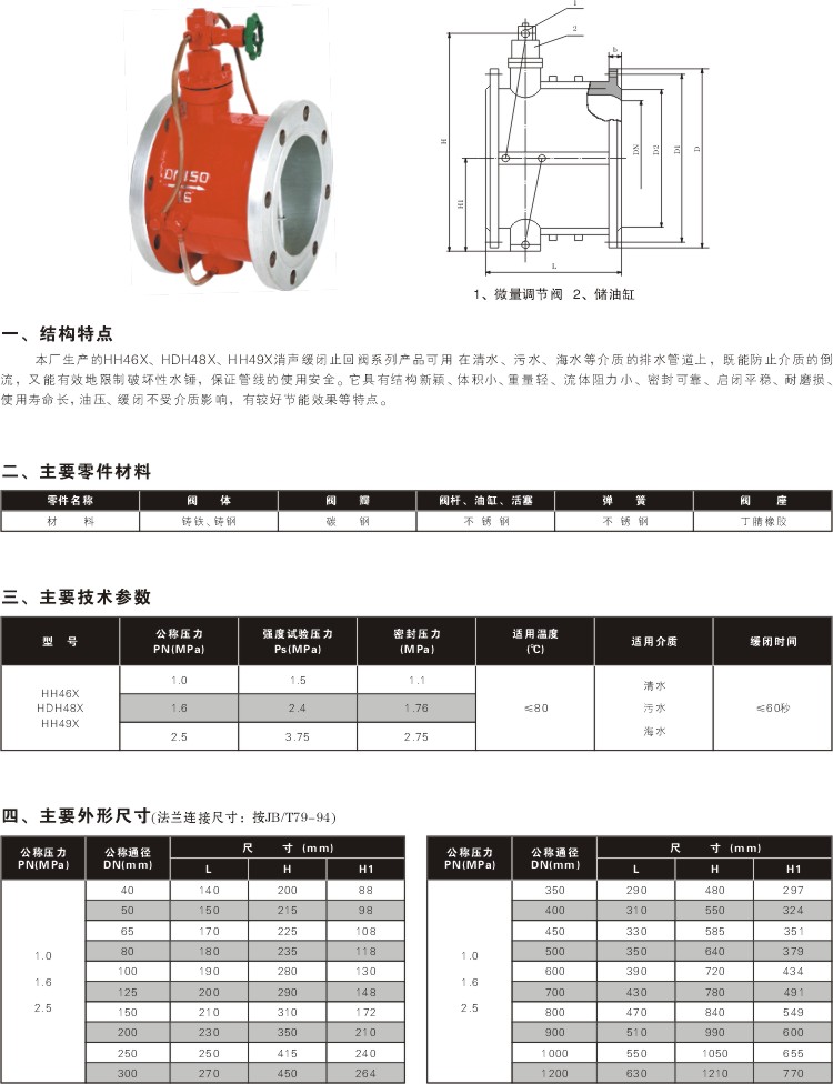 公稱通徑:DN40-700 壓力等級:PN1.0-2.5MPa 材質:碳鋼 產品概述   微阻緩閉止回閥用于給排水管道,安裝在水泵出口處用來防止介質逆流和消除破壞性水錘,并且有效地減少閥門關閉水錘壓力,可保障管網安全運行。止回閥具有閥瓣輕、開度大、節電效果顯著,流體阻力小,水錘消除機構設計新穎,密封性能穩定可靠、耐磨損、使用壽命長、運行平穩、無振動、無噪聲等特點。 止回閥主要技術參數 公稱壓力:1.0~2.5MPa 公稱通經:40~800mm 適用介質:水、弱腐蝕性液體 適用溫度:0~80℃(如需要,可達200℃) 法蘭標準:GB/T 17241.6 GB/T 9113 試驗標準: GB/T 13927 AP1598 主要零部件材料 零件名稱 閥體、閥蓋 閥瓣 閥軸 材料 灰鑄鐵、鑄鋼 鋼板、橡膠組合件 不銹鋼