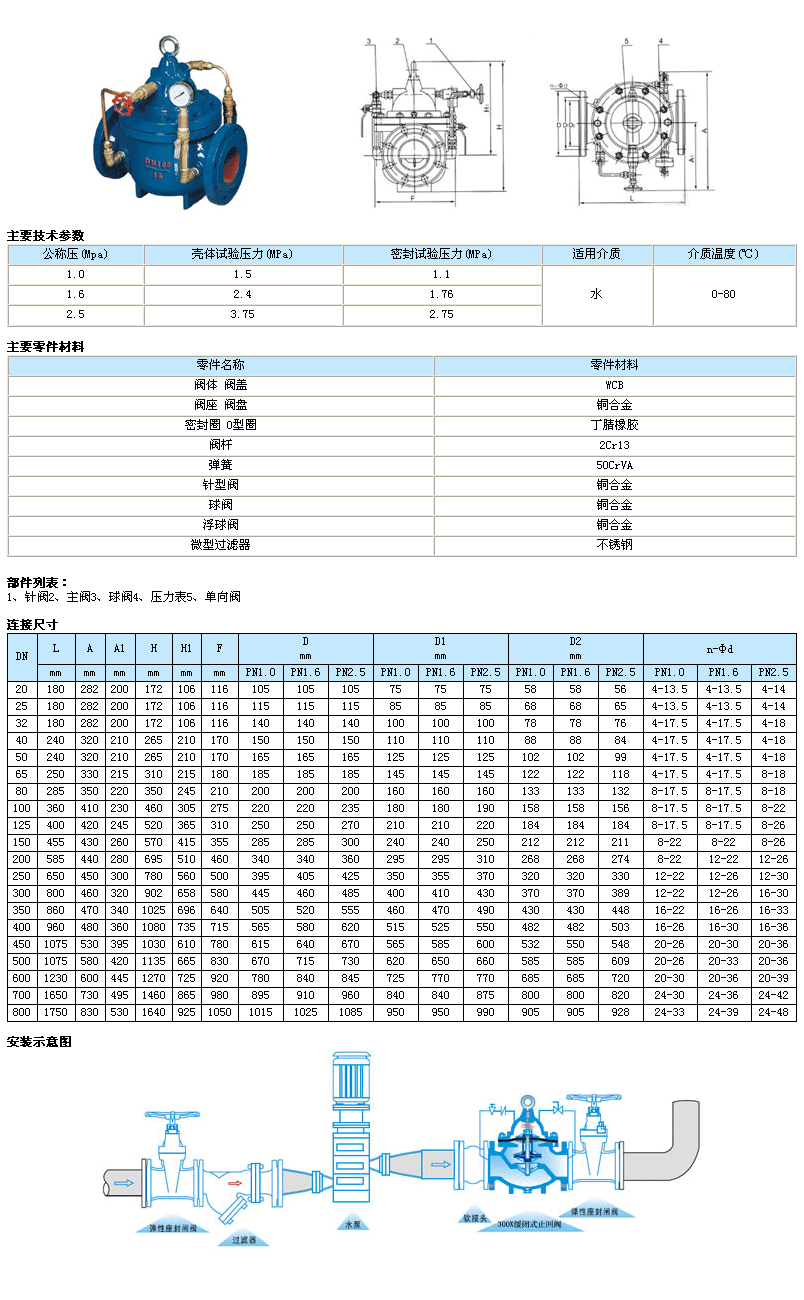 300X緩閉止回閥由主閥、單向閥、針閥、球閥、微形過濾器和壓力表組成水力控制接管系統(tǒng)。利用水力自動操作,可使主閥得到佳的開啟或關閉速度。防止水鍾水擊的產(chǎn)生,以達到緩閉消聲的效果。本產(chǎn)品利用水力自力控制,不需要其它裝置和能源,保養(yǎng)簡便,開啟及緩閉平穩(wěn)。本系列閥門產(chǎn)品廣泛用于高層建筑、生活區(qū)等供水管網(wǎng)系統(tǒng)及城市供水工程。當閥門從進口端給水時,水通過微型過濾器、針閥、單向閥進入主閥控制室,再經(jīng)過球閥排水至下游。因為針閥開度小于球閥開度,即主閥控制室的排水速度大于進水速度,因此控制室壓力降低,作用于主閥盤下端的進口壓力打開主閥向下游供水。當管道停止供水時,若下游水開始回流,一部分回流水經(jīng)球閥進入主控制室,由于單向閥作用,回流水不能從主控制室流出,引起主控制室逐漸升壓,緩緩關閉主閥。 |